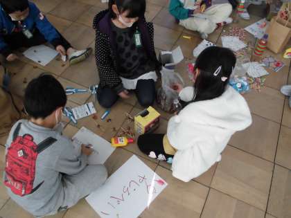 生活科の学習で,拾ったどんぐりなどを使った秋のお店やさんごっこの準備をしています。