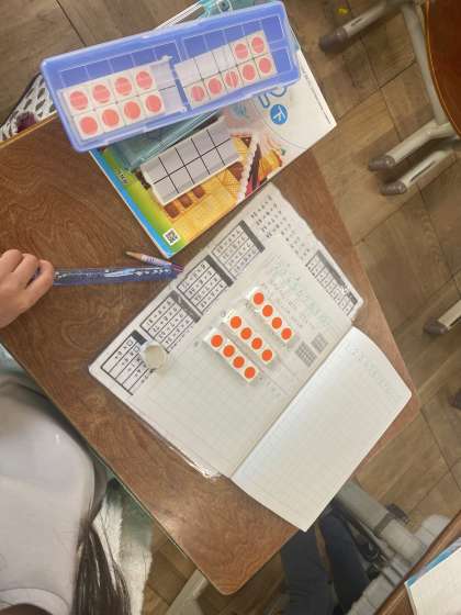 もとの大きさを同じ大きさに2つに分けたうちの1つ分の大きさを二分の一と学習しました。12個のおかしの二分の一の大きさを数図ブロックで考えました。同じ大きさに分けることをつかんだ2年生は三分の一の大きさも考えました。分数大好き2年生です。