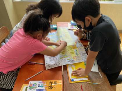 東西南北を覚えた3年生に校区地図を渡してみました。施設を見つけたり,知っている公園を見つけて日野小学校から見てどの方角にあるかをグループで相談しました。校区のことをたくさん知っていきましょう♪