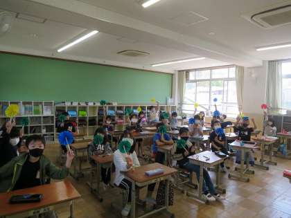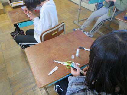 折り紙と割りばしを使ってまるく開く扇を作りました。できあがった扇でいろいろな角を作ってみました。