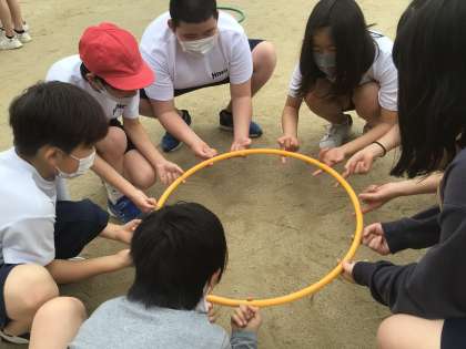 体育も今年度初めて授業がありました。最初なので体ほぐしの運動をしました。フラフープを使って心を一つにがんばっていました!