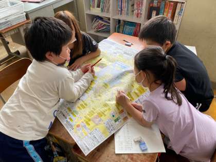 校区地図と防災マップを見比べながら,校区に何があるのかを調べていきました。