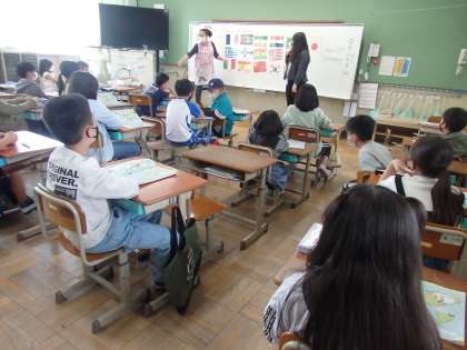 外国語の学習でALTの先生と一緒に国旗の言い方の練習をしました。元気に楽しく学習を進めることができています。楽しみながら,英語の言い方にどんどんなれていってほしいと思います。