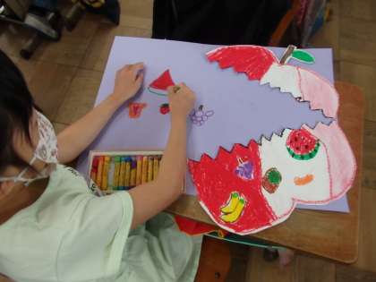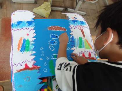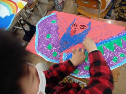 先週の図画工作の時間に,不思議なたまごを描きました。今日はそのたまごが割れたら中からどんなものが出てくるのか…不思議なたまごから想像したことや不思議なたまごから生まれてくるものを楽しく想像して描きました。形や色などを工夫して楽しく制作することができました。