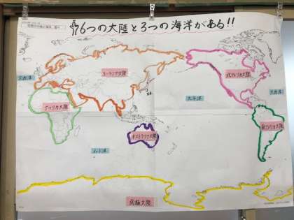 教室には大陸と海洋を確認できる掲示物がありました。これで,テストもばっちりですね。
