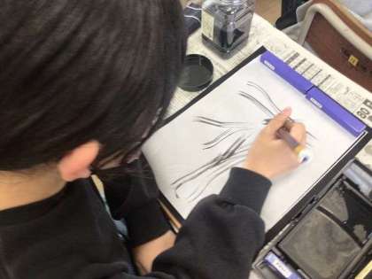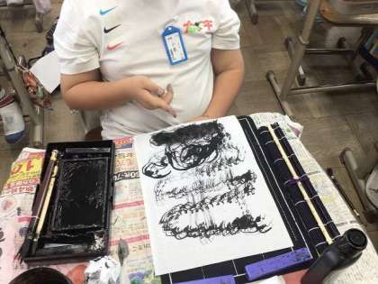 今年初めての図工では墨と水を使って絵を描きました。あらかじめ描くものを決めるのではなく,出てきた模様からどんな絵に見えるかを考えました。