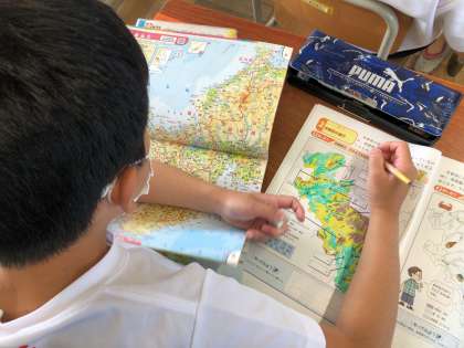 社会科の学習でわたしたちの住む京都府のことについて調べています。地図帳を使って,京都府の地形や海や川について調べて交流しました。