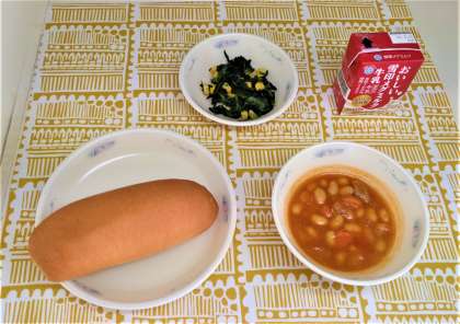 ポークビーンズの大豆は給食室でゆでて柔らかくしたものを豚肉と一緒にケチャップ,ウスターソース,塩,こしょうで味付けをしてじっくりと煮込んでいます。