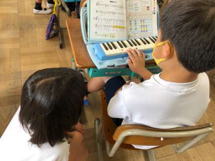 もうすぐリコーダーを使った学習が始まります。それに向けて,歌に合わせてまずは鍵盤ハーモニカで演奏の練習をしました。感染対策のため実際に演奏はできませんが,指使いの練習をしました。友達と教え合うことで指使いができるようになっていました。