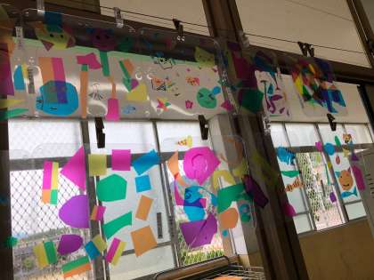 「ひかりのプレゼント」という学習で,光を通す作品作りをしました。貼り方や切り方を工夫して,光の見え方を確かめながら作りました。素敵な作品がたくさん仕上がりました。