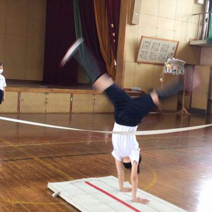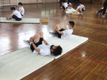 マット運動では自分のできる技をつなげて連続技にする時間と,できない技に挑戦する時間に分けて練習しています!徐々に形になってきています!