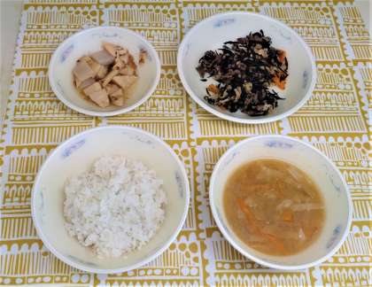 今月はひじき,たけのこ,キャベツ,たまねぎ,じゃがいも…と春が旬の食べ物がたくさん登場しています。