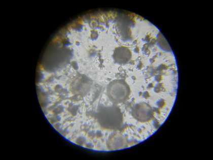 実は蒜山が噴火した時にせき止められてできた大きな池に積もったケイソウの死骸で,顕微鏡でみると殻の丸い形が無数に見えました。殻だけが残ってこんなに軽い土になったのです。珪藻土といって,多孔質の性質を利用して,プールのろ過材や壁土の材料として使われています。食品添加物としてもシャリシャリ感を出すのに使われているようです。