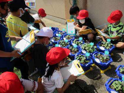 1年生の生活科では,あさがおを育てています。毎日,一生懸命水やりをして,元気に育っています。きれいな花が咲くのが楽しみです。