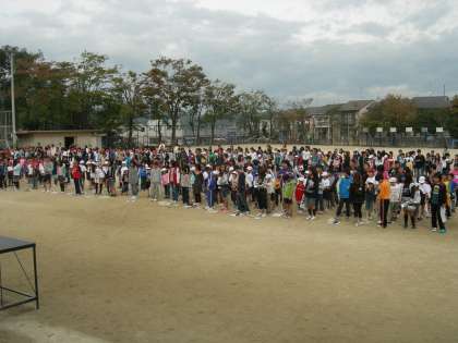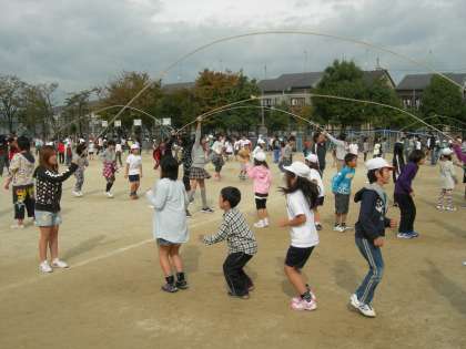 1〜6年生の6,7人が力を合わせて跳ぶ回数を競います。18日(金)の本番に向けて,5,6年生を中心にうまく跳べるように協力していきます。