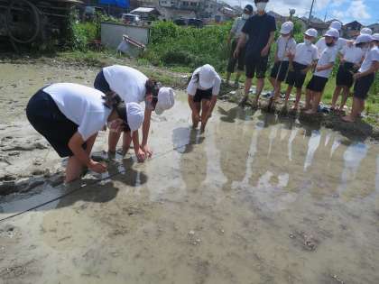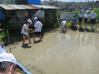 昨日の雨で延期になった田植え体験をしにいきました。地域の先生に田植えの仕方を説明していただき,一つずつていねいに植えていきました。