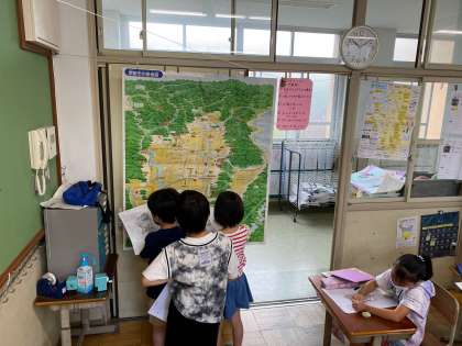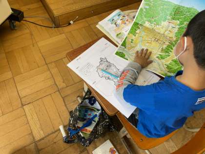 京都市の色々な場所を調べた3年生は京都市自慢を書いていきます。市内地図を見ながら,自慢する場所を確認していました。
