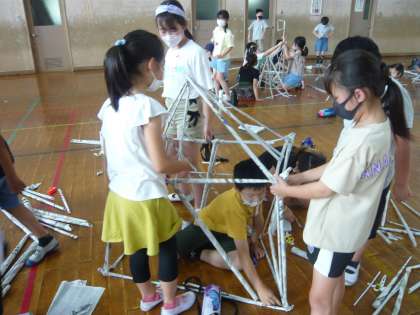 学年で図工をしました。新聞紙を細く丸めたものをたくさん作り,グループに分かれてそれらをつなぎ合わせて色々なものを作りました。暑さも忘れるくらい熱中していて,倒れないように様々な工夫をしながら一生懸命取り組んでいました。