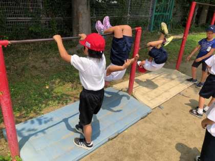 体育の学習でてつぼうあそびをしています。前回りや逆上がり,地球周りなどいろいろな技に挑戦しています。順番を守って,お友だちと教え合いながら技に挑戦する姿が見られました。