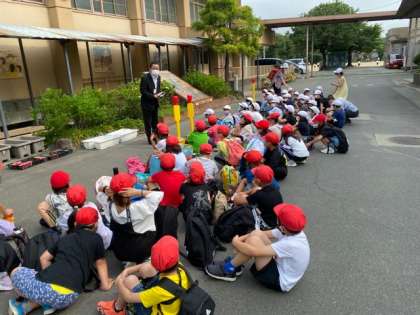 入学してから初めての社会見学!時間通りに全員集合。校長先生のお話を聞いていざ出発です。
