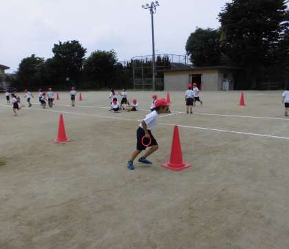 体育では,「水遊び」と並行して,「リレー遊び」をしています。