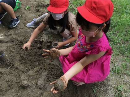 図工「すなやつちとなかよし」では,中庭の砂場で,砂や土をたくさんさわって,作りたい形を作りました。どろだんごを作ったり,持ってきたカップで作ったり,山を作って周りに水を流してみたり…。思う存分,砂や土と仲良くなれました。