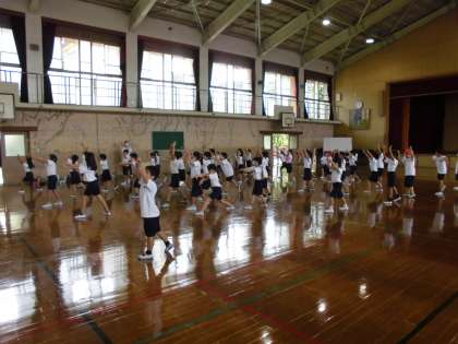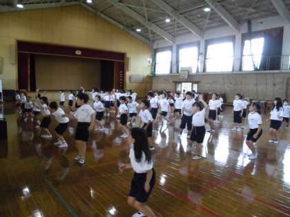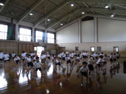 体育館での練習が始まりました。体を大きく動かして踊ることができていました。