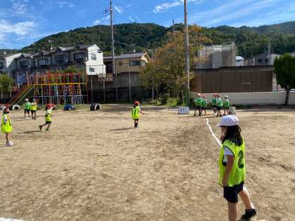体育のハンドベースボールが始まりました。ルールを確認しながら,みんなで一緒に守備をしています。攻撃も考えながら楽しみたいですね♪