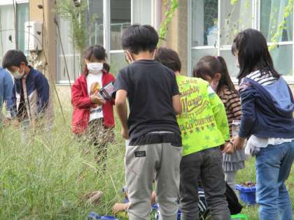 中庭にいるいきものを探しました。「すごく大きなバッタがいた!」「先生,見て!かえるをつかまえた。」等々,みんな生き生きと活動していました。