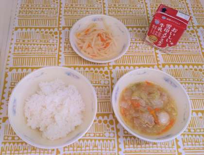 肉だんごのスープ煮の肉だんごは給食室で調理員さんが一つ一つ丸めて作ってくださっています。