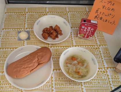 学校では塩・こしょう・料理酒で下味をつけて米粉と片栗粉で衣をつけた後油であげた鶏肉をケチャップ・ウスターソース・砂糖・水で作ったソースに絡めて仕上げています。
