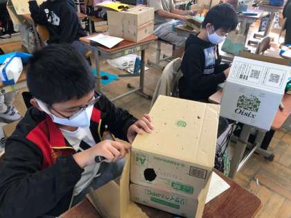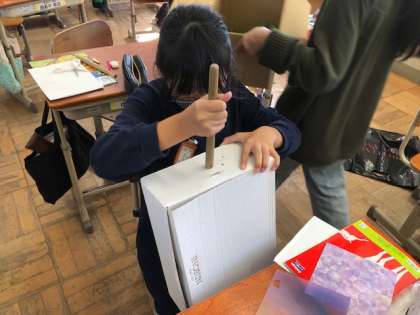 図画工作では,「のぞいてみると」という学習をしています。暗い空間に光が差し込むとどんな世界が広がっているのか・どんなことが起こっているのかを想像しながら作っています。