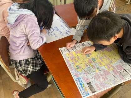 グループで日野のよいところを相談していました。校区マップを見ながら,話しあっている姿がありました。