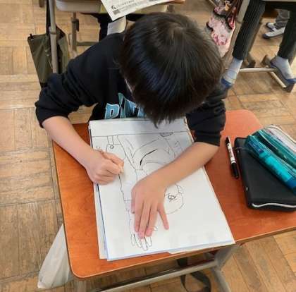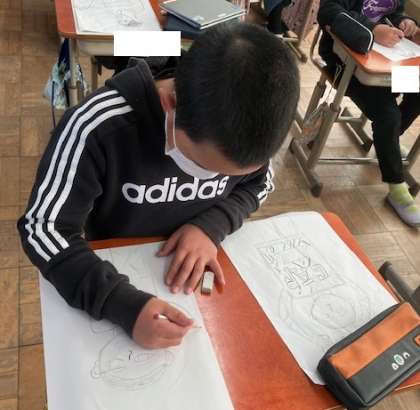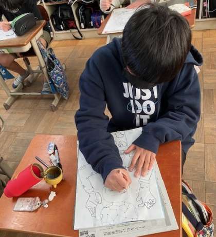 図画工作のでは,木版画の学習が始まりました。テーマは「〇〇をしている私」。表現したい線にこだわり,下絵をしています。