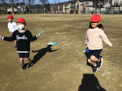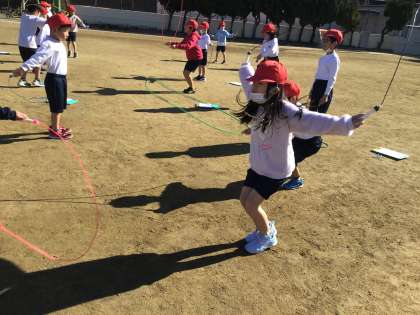 体育の学習や休み時間などで,なわとびの練習を頑張っています。いろんな技に挑戦したり,引っかからずに跳べるように工夫して跳んだりしています。