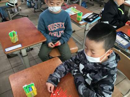 数え棒を使って,大きな数を表したり,数えたりしています。何がいくつ必要か考えながら,たくさん手を動かして答えを出せるようになってきました。