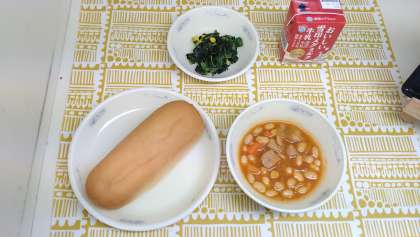 今日のポークビーンズは給食室でゆでた大豆と炒めた豚肉や野菜をホールトマトと一緒に煮て,ケチャップやウスターソースなどの調味料で味付けをして仕上げてます。