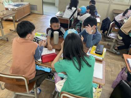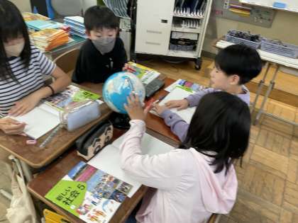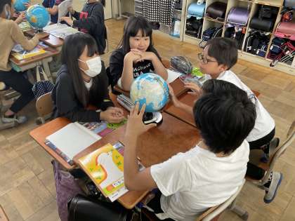 社会科の学習で地球儀を使っていろいろな国を調べました。「ハワイがあった!」「どこ?どこ?」とみんなおおはしゃぎで学習していました。