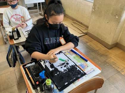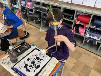 図画工作の学習で墨絵に挑戦しました。墨に水を加えると濃淡が変わったり、にじみ広がったりしておもしろい作品が出来ました。