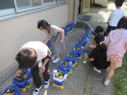 毎日,朝の準備が終わったあとに,アサガオに水をあげています。