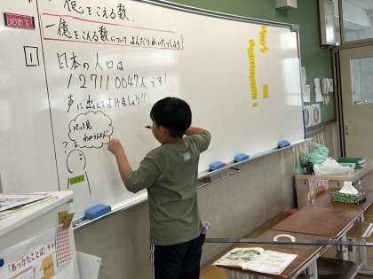 新しい単元,「一億をこえる数」の学習をしています。大きい数は数字だけでは読みにくいので,漢字に直したり,位をかいたりしました!