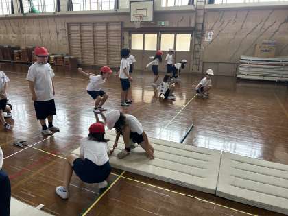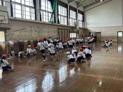 体育館で2クラス合同で反復横跳びや上体起こしなどの体力テストをしました。全員去年の記録を更新できたかな?