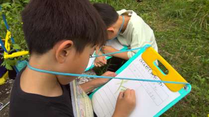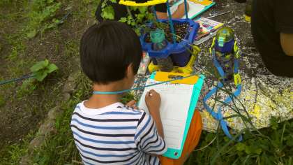 育てている野菜を観察しました。ミニトマトは,もう青い実がついてきました。実や花の様子をよく見て,書いていました。