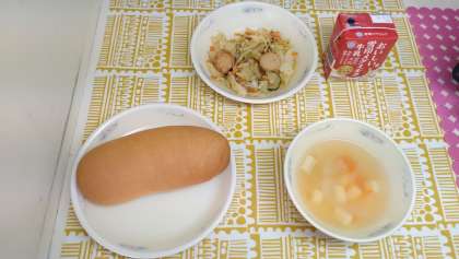 ソーセージと野菜のいためナムルは野菜をいためた後油で揚げたソーセージとじゃがいもを加えて,最後に砂糖・しょうゆ・酢とすりごまを加えて仕上げた献立です。