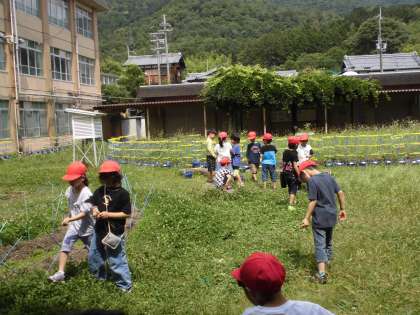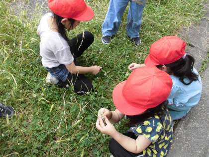 オオバコなどの草で相撲をしたり、シロツメクサで花束やかんむり作りに挑戦したり、ペンペン草の音を聞いてみたりと、楽しく活動していました。