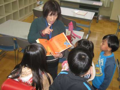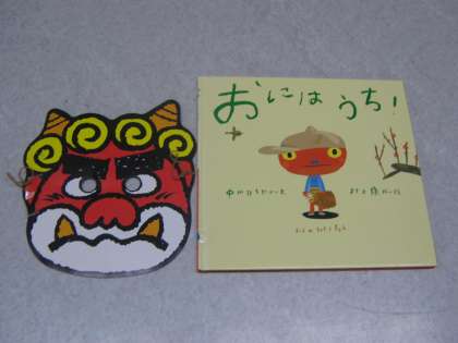 それから、「おにはうち」という絵本の読み聞かせ。やさしく,人間と仲よくしたい「におくん」のことを気に入ったようで,絵本の中の「鬼は外!」のかけ声に、「え〜!」「だめ!」という子どもたちの悲鳴のような声が返ってきました。でもお話の中の先生が「いい鬼は内!」と言ってくれて、にこやかな笑顔が戻ってきました。