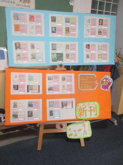 図書委員さんがまたまた新刊の紹介をしています。紹介されている本をかりることができるといいですね。