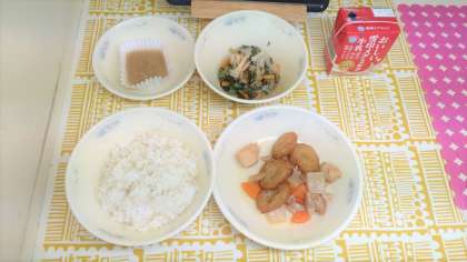 ういろうは給食室で米粉と黒砂糖を水で混ぜて作った生地を一つずつ分けてスチームコンベクションオーブンで蒸した手作り和菓子です。