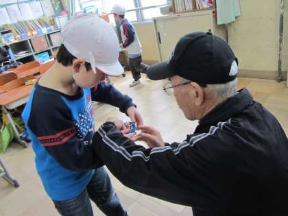 今回はけん玉・こま・あやとり・おはじき・お手玉・めんこの6つの遊びを教えてもらいました。