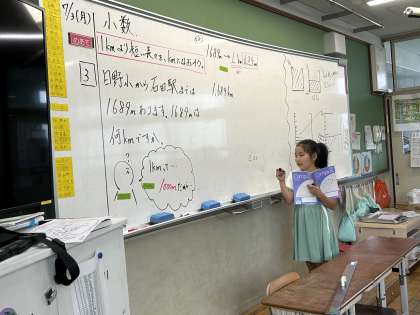 算数では小数の単元に入りました。単位を変えることで小数点はどこに移動するのか前に出てたくさん説明していました。